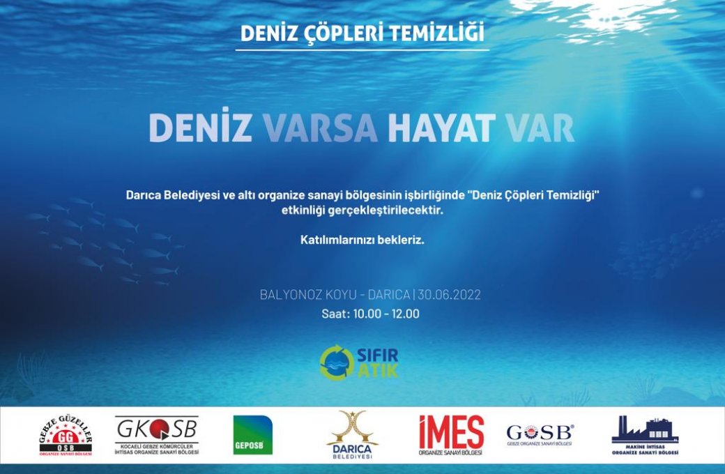 Darıca Belediyesi ve altı organize sanayi bölgesi işbirliğiyle 30 Haziran 2022 Perşembe günü 10:00-12:00 saatleri arasında Balyonoz Koyu'nda gerçekleştirilecek olan "Deniz Çöpleri Temizliği" etkinliğine tüm sanayicilerimiz ve çalışanları davetlidir.