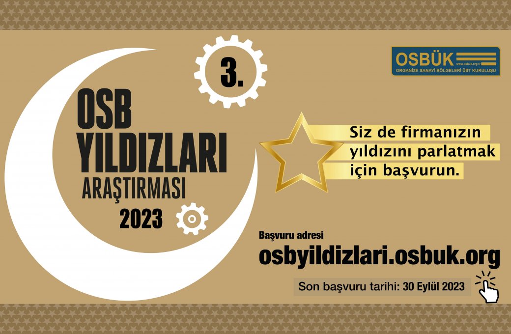 OSBÜK tarafından geçen yıl ikincisi yapılan ve katılımın gönüllülük esasına dayalı olduğu "OSB Yıldızları Araştırması" bu yıl da tekrarlanmaktadır. Türkiye ekonomisinin lokomotifi olan OSB’ler ve bünyesinde faaliyet gösteren firmalar hakkında yapılan ve kaynağından derlenen verilere dayalı tek çalışma olan "OSB Yıldızları Araştırması 2023” OSB’lerdeki firmaların performansının ödüllendirildiği gelenekselleşmiş etkin bir referans kaynağıdır. Araştırmaya başvuran firmalar yurtiçi satışlar, ihracat, istihdam, kadın istihdamı, çevreci yaklaşımlar ve AR-Ge harcamaları kategorilerinde değerlendirmeye alınacak ve her kategoride dereceye giren firmalar yanında, 2021 ve 2022 değerlerinin karşılaştırılması ile en iyi performans gösteren firmalar belirlenerek OSBÜK tarafından ödüllendirilecektir.